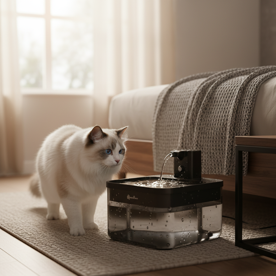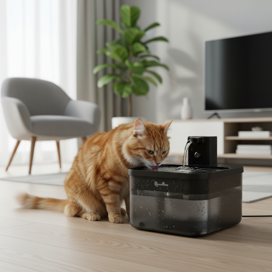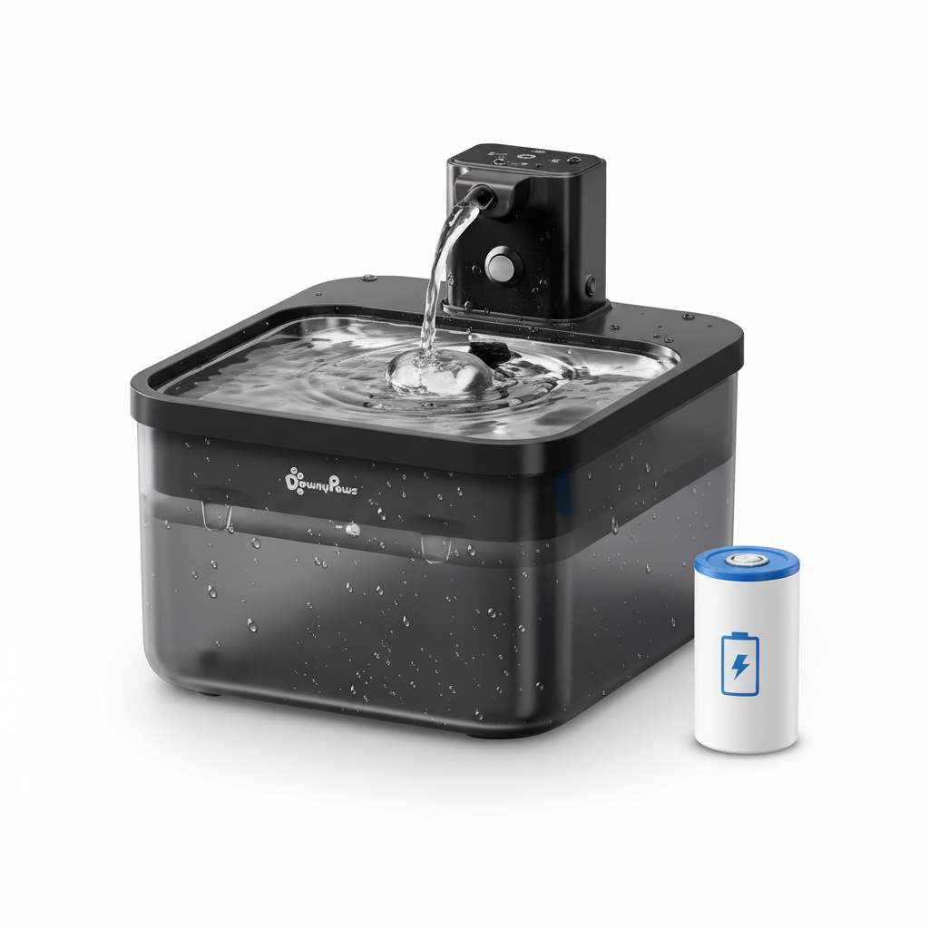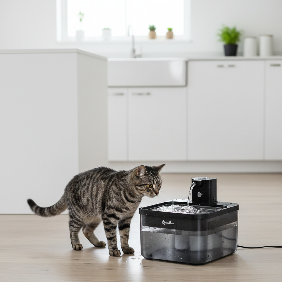 Fontaine à eau automatique pour chat avec batterie rechargeable. Distributeur d'eau avec système de circulation continue et cascade apaisante.