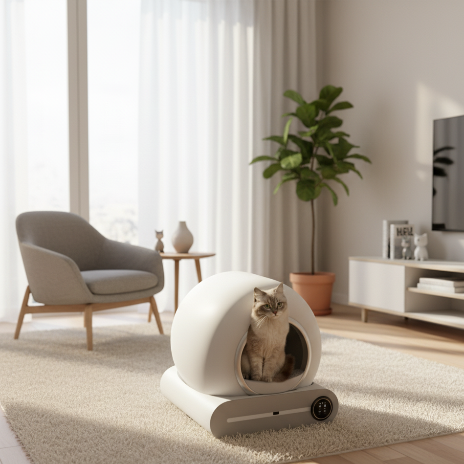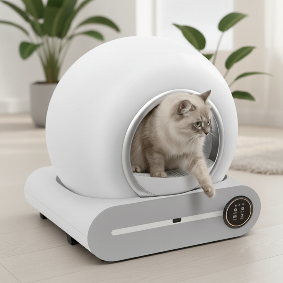 Litière autonettoyante pour chat au design sphérique moderne. Système automatique avec base de rangement intégrée.
